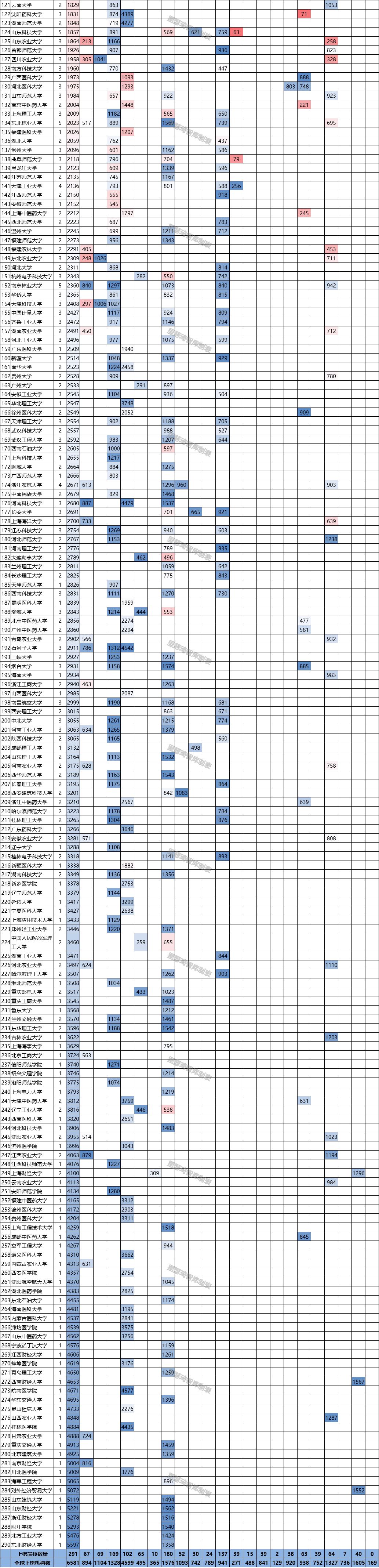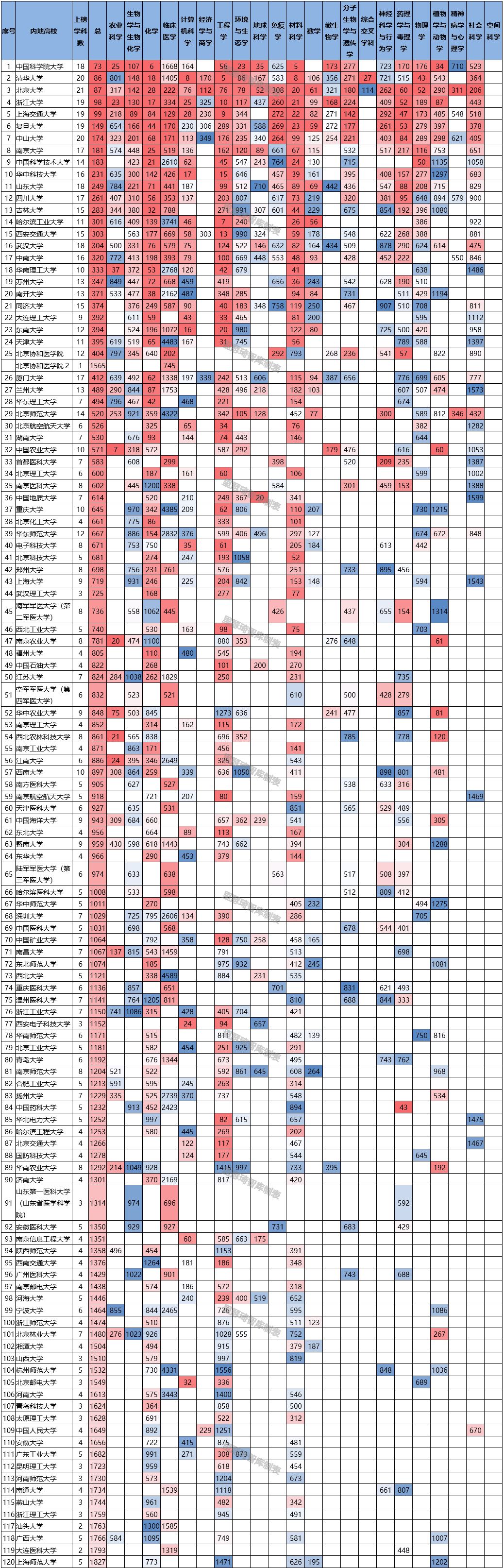 本次上榜的国内高校分布在21个学科,空间科学一个学科尚无内地高校进入。各学科内地高校上榜数量如下图:化学、临床医学、工程学、材料科学超过100所高校上榜,但是从占比看;内地高校占比超过10%的学科有5个:化学、计算机科学、工程学、材料科学、数学。 新上榜5所高校:上海工程技术大学(新增工程学学科)、西南财经大学(新增社会科学学科)、皖南医学院(新增临床医学学科)、对外经济贸易大学(新增社会科学学科)、山东财经大学(新增工程学学科)等。皖南医学院临床医学学科曾在2019年11月上榜,2020年1月滑落,此次再次上榜。 此外,40所高校学科数共增加43个,分布在16个学科,工程学学科新增7所高校,材料科学学科新增6所高校,社会科学学科新增5所高校,神经科学与行为学学科新增4所高校,临床医学、化学、环境与生态学、农业科学等四个学科增加3所高校,计算机科学增加2所高校。 其中3所高校均新增2个学科上榜,西南大学新增环境科学与生态学、神经系统学与行为学;石河子大学新增化学、临床医学;河南科技大学新增农业科学、工程学。 具体学科变动数据见下: 此次按照总被引频次排名,下列表格按照学校总排名列示,横轴标题为22个ESI学科及各高校进入排行榜学科数分析,表格内容为各中国高校在各学科的国际排名。 备注:中国地质大学、中国石油大学和中国矿业大学三所高校并没有区分两地办学的情况。 ESI( Essential Science Indicators,简称ESI)为科睿唯安(前汤森路透科技与医疗集团)的《基础科学指标》英文缩写,是当今普遍用以评价大学和科研机构国际学术水平及影响的重要指标,也是全球公认的判断学科发展水平的重要参照之一。目前,ESI已成为当今世界范围内普遍用以评价高校、学术机构、国家/地区国际学术水平及影响力的重要评价指标工具之一,其数据库以学科分门别类(共分22个学科),采集面覆盖全球几万乃至十几万家不同研究单位的学科。 ESI学科排名有3种方式,分别依据总被引次数、论文总数和篇均被引次数排序,其中被采用较多的一般是按总被引次数的排名。ESI数据库每两个月更新一次。 以上数据为人工整理所得,如有错误或遗漏,敬请指正。